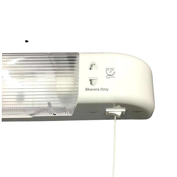 A modern white cased bathroom LED shaver light ideally fitted above a mirror in a bathroom with a dual voltage shaver socket.