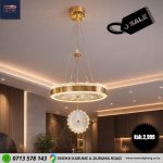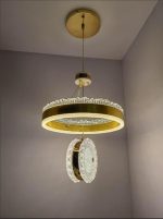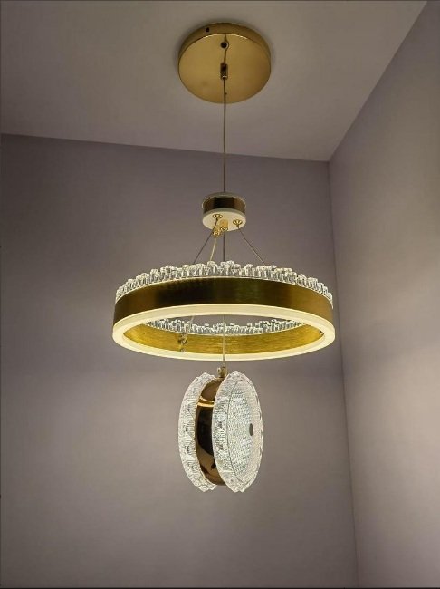 Design: Modern circular pendant with an integrated LED ring and a crystal-effect diffuser.